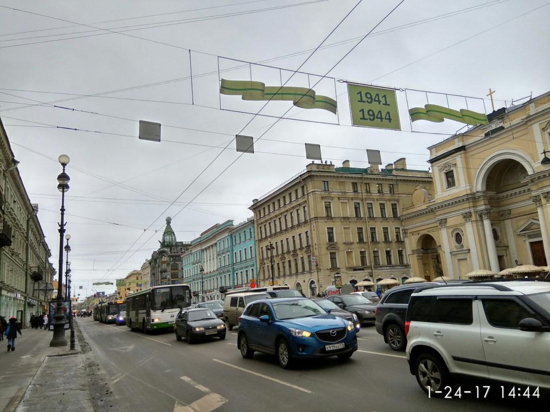 The Christmas and New Year decorations have been removed in Nevsky Prospekt, and replaced with signs recalling the seige.