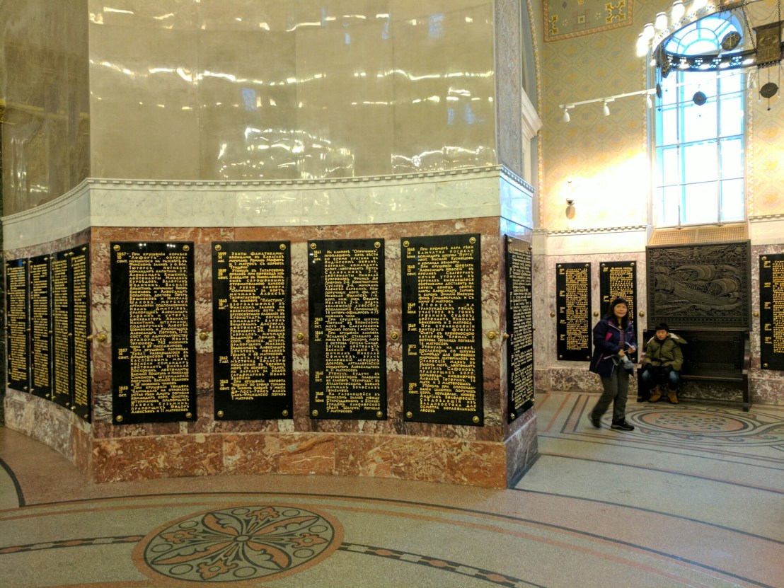 There are names of naval personnel lost in battles back to the Crimean war on tablets around the wall. This is just a small part of them: