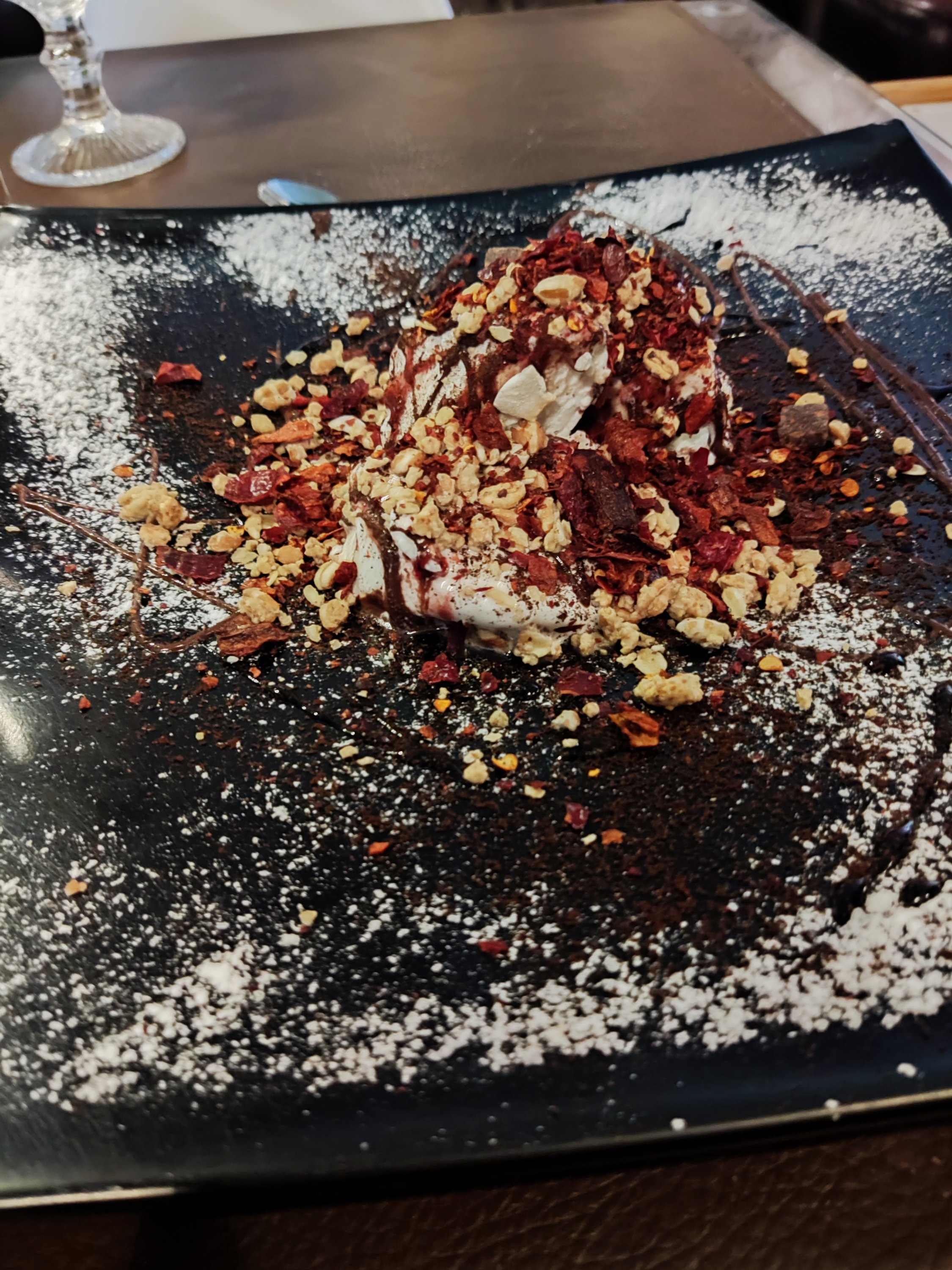 Ice cream with roasted chilli, pistachio and chocolate pieces
